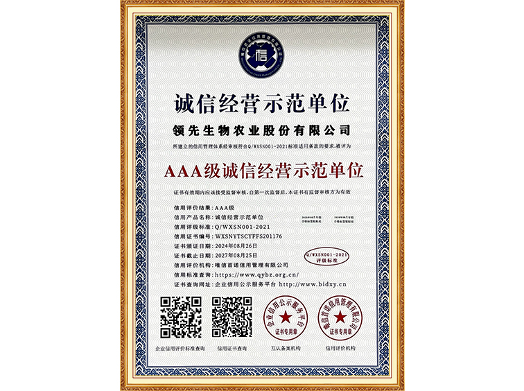 AAA級(jí)誠(chéng)信經(jīng)營(yíng)示范單位