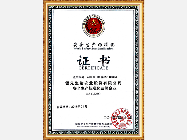安全生產(chǎn)標(biāo)準(zhǔn)化企業(yè)證書