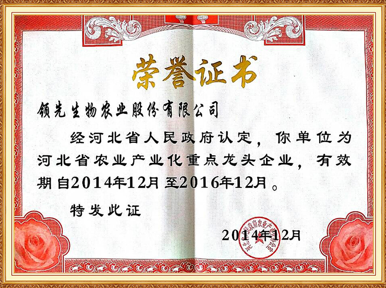 河北省農業(yè)產業(yè)化重點龍頭企業(yè)證書